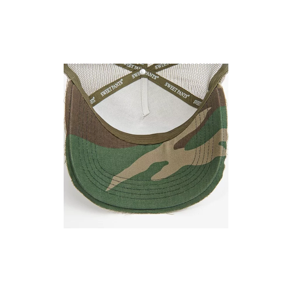 CASQUETTE TRUCKER EN BI-MATIÈRE ET BICOLORE. PATCH LOGO SWEET PANTS SUR LE DEVANT AVEC TRANCHE VISIÈRE EFFET « DESTROY » ET TISSU ENVERS VISIÈRE IMPRIMÉ CAMOUFLAGE. LA TAILLE EST UNIQUE ET AJUSTABLE POUR UN TOUR DE TÊTE DE 56 À 60 CM 55% POLYESTER 45% COTON.