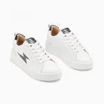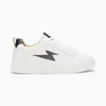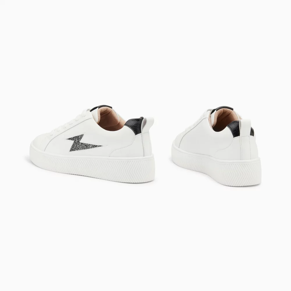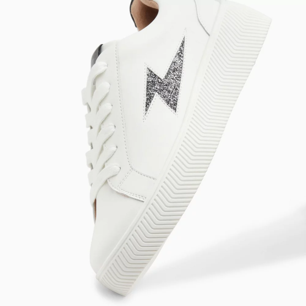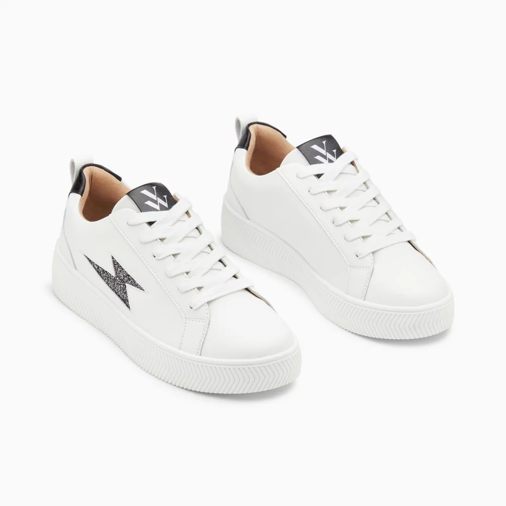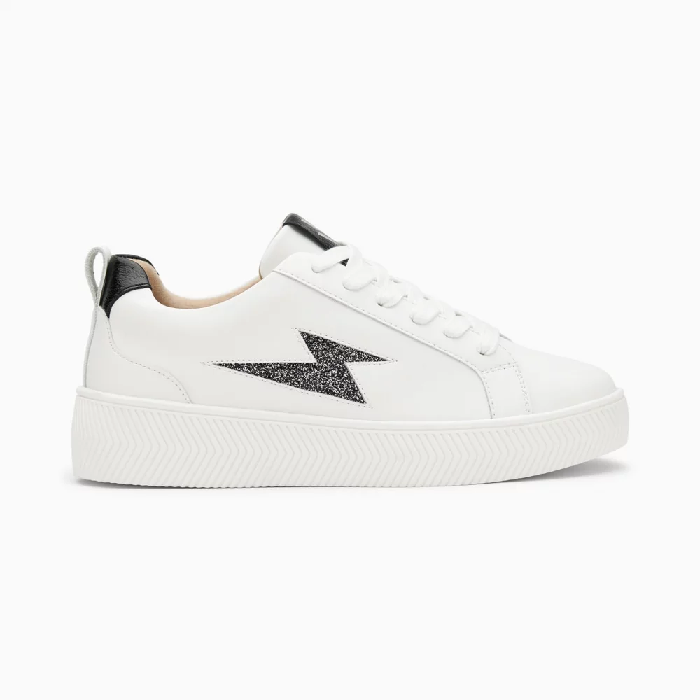 - BASKETS EN SIMILICUIR BLANC - DÉCOUPE EN FORME D'ÉCLAIR EN SIMILICUIR NOIR À PAILLETTES ARGENT ET ANTHRACITE - PATCH ARRIÈRE EN SIMILICUIR NOIR TEXTURÉ - FERMETURE À LACETS BLANCS - BOUT ROND - SEMELLE ÉPAISSE BLANCHE STRIÉE HAUTEUR DU TALON : 4 CM HAUTEUR DE LA PLATEFORME : 2,5 CM HAUTEUR DE LA TIGE : 6 CM CE MODÈLE TAILLE PETIT, PRENEZ LA TAILLE DU DESSUS.