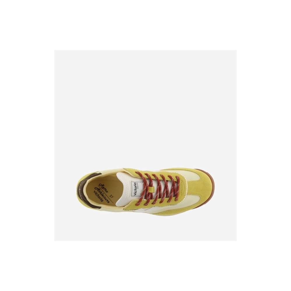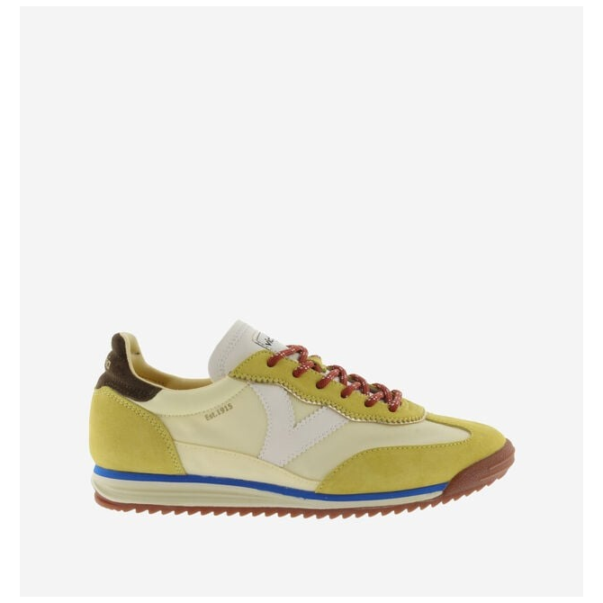 SNEAKERS POUR FEMME FABRIQUÉES EN NYLON AVEC DES EMPIÈCEMENTS SUPERPOSÉS EN DAIM. V LATÉRALE DE VICTORIA EN EFFET CUIR BLANC CONTRASTANT. FERMETURE PAR LACETS COLORÉS DE TYPE ROND AVEC MOTIF TON SUR TON. SEMELLE BICOLORE EN CAOUTCHOUC AVEC PATIN CRANTÉ EN EVA COULEUR CARAMEL.