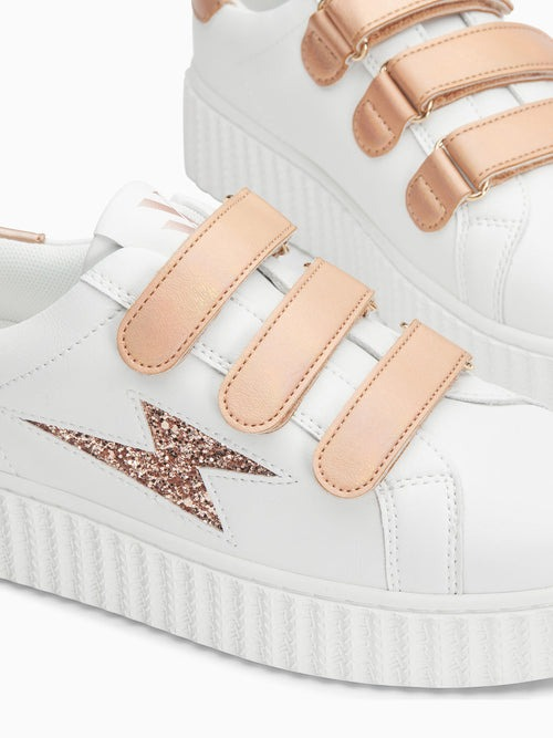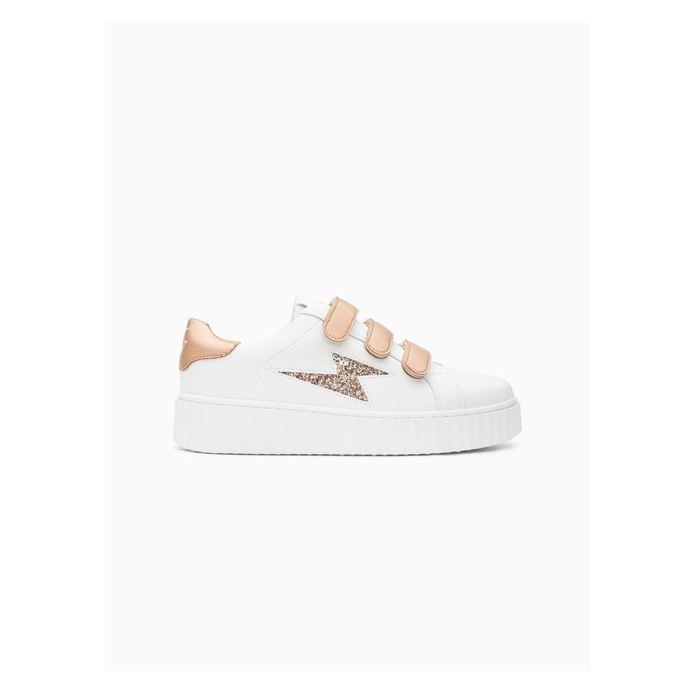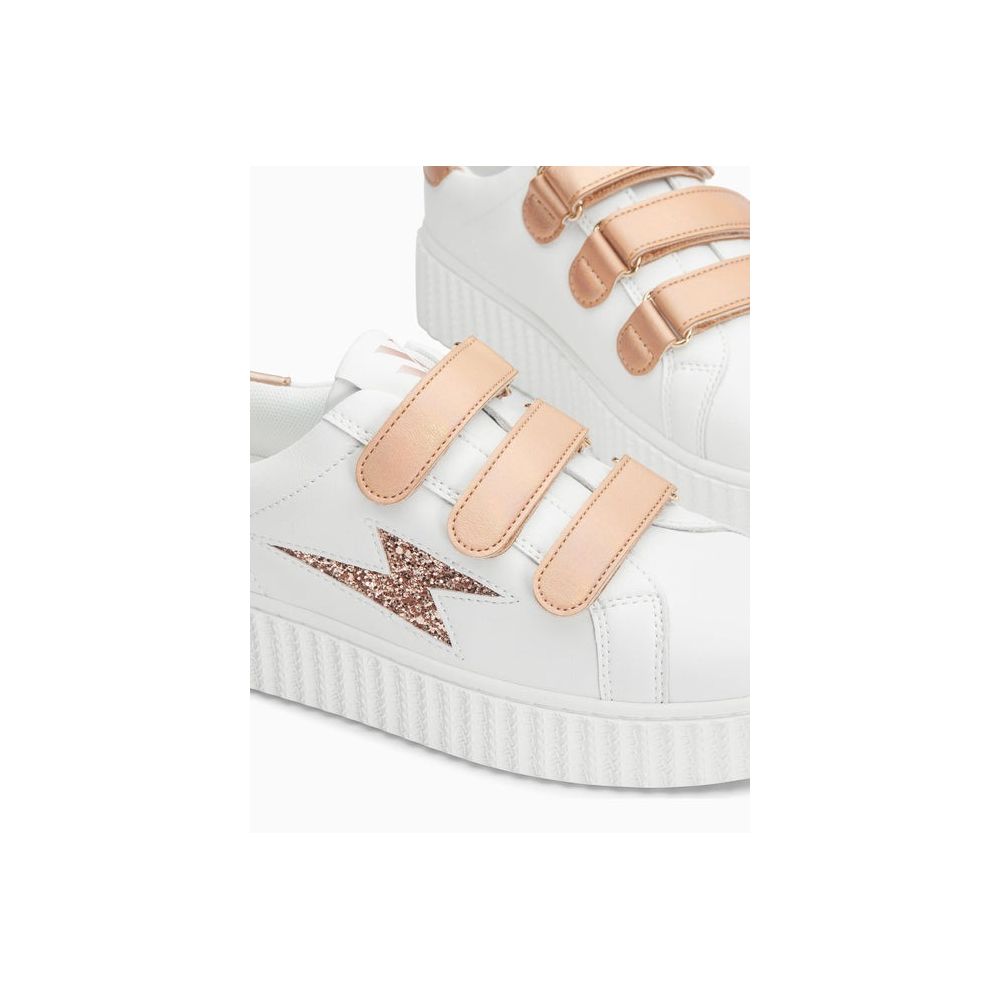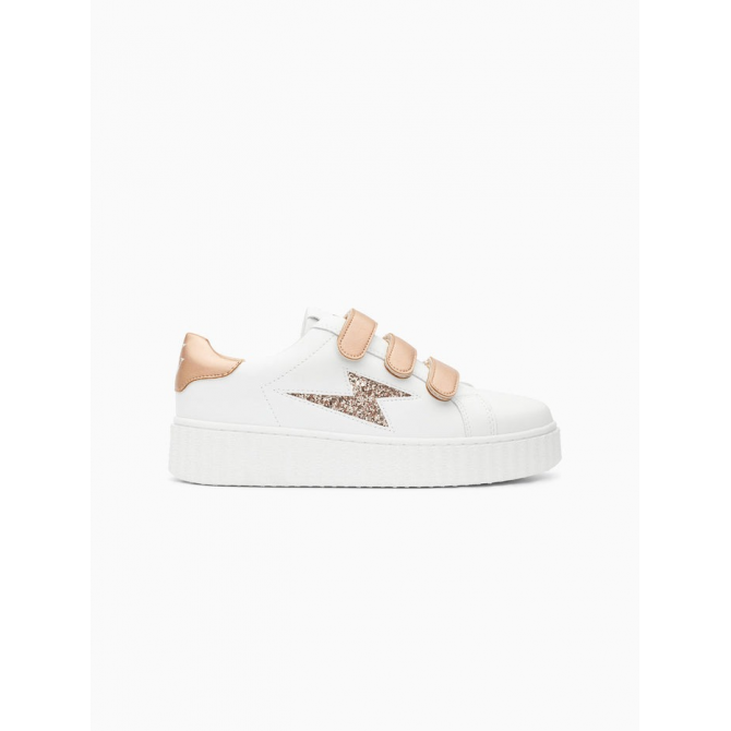 - BASKETS EN SIMILICUIR BLANC - DÉCOUPE EN FORME D'ÉCLAIR À PAILLETTES ROSE GOLD - PATCH ARRIÈRE ET SCRATCHS EN SIMILICUIR TEXTURÉ ROSE GOLD IRISÉ - BOUT ROND - SEMELLE CREEPERS BLANCHE CE MODÈLE TAILLE NORMALEMENT, PRENEZ VOTRE POINTURE HABITUELLE. POUR LES DEMI-POINTURES, PRÉFÉREZ LA TAILLE DU DESSUS. TIGE : SYNTHÉTIQUE DOUBLURE : TISSU SEMELLE INTÉRIEURE : TISSU SEMELLE EXTÉRIEURE : CAOUTCHOUC