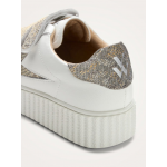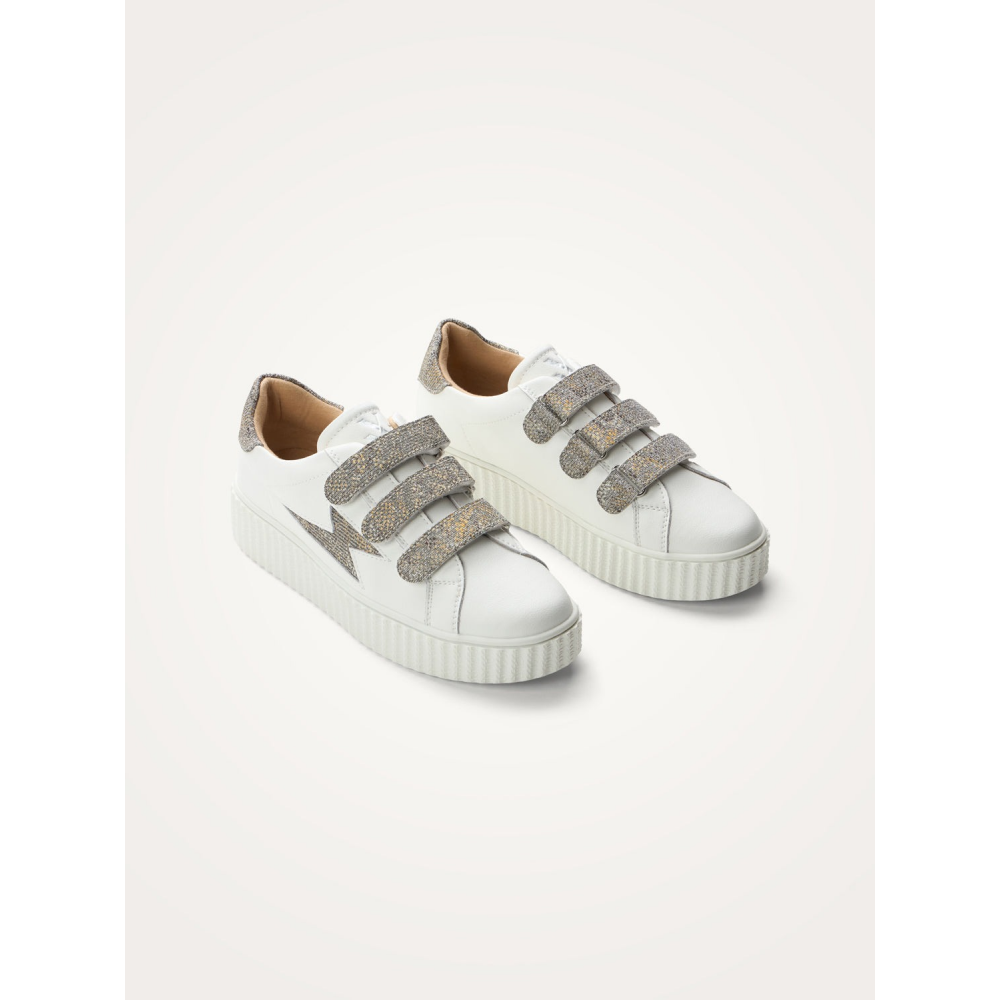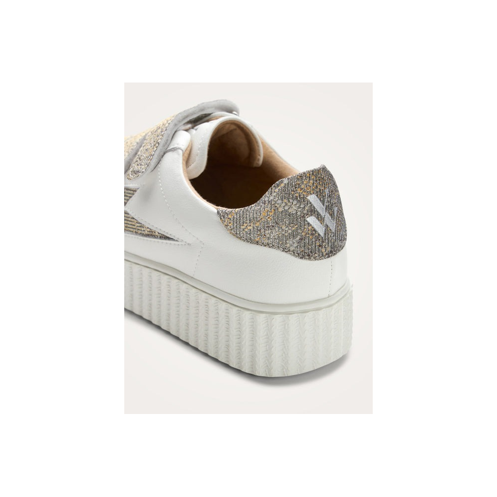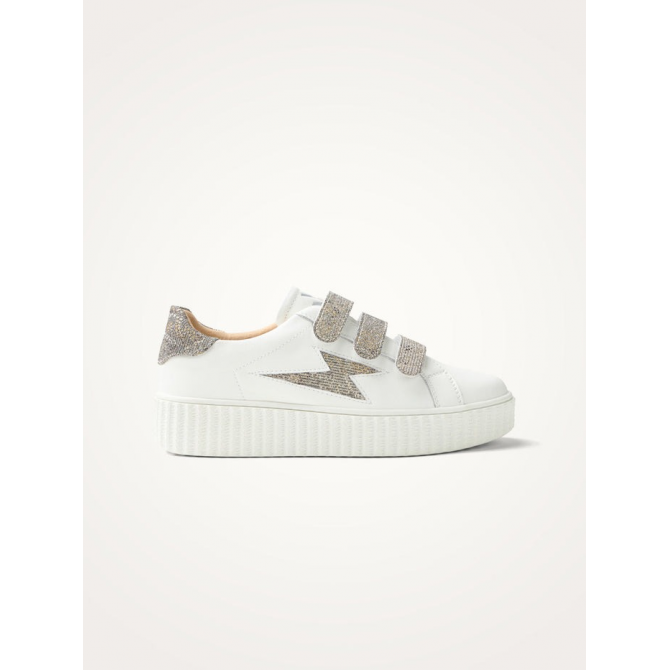 Composition - BASKETS EN CUIR BLANC - DÉCOUPE EN FORME D'ÉCLAIR - PATCH ARRIÈRE ANTHRACITE À FILS ARGENTÉS ET IMPRIMÉ TACHETÉ OR ARGENT ET BRONZE - FERMETURE À SCRATCHS - BOUT ROND - SEMELLE CREEPERS BLANCHE CE MODÈLE TAILLE NORMALEMENT PRENEZ VOTRE POINTURE HABITUELLE. POUR LES DEMI-POINTURES PRÉFÉREZ LA TAILLE DU DESSUS. TIGE : CUIR SYNTHÉTIQUE DOUBLURE : TISSU SEMELLE INTÉRIEURE : TISSU SEMELLE EXTÉRIEURE : CAOUTCHOUC SYNTHÉTIQUE