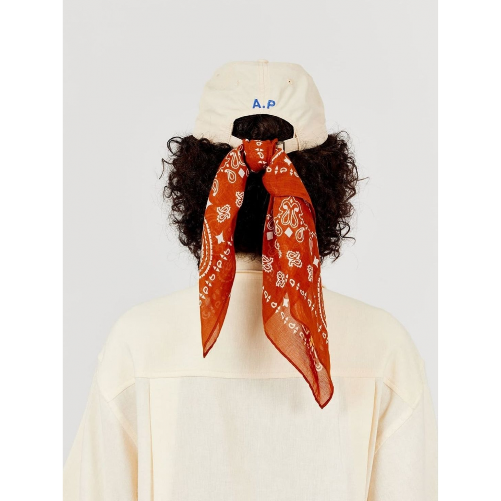BANDANA MARRON 75. À NOUER DANS LES CHEVEUX OU AUTOUR DU COU. FORME CARRÉ. DIMENSIONS 55 X 55 CM. TISSU EN VOILE DE COTON IMPRIMÉ DE MOTIFS CACHEMIRE. LOGO AP CONTRASTÉ DANS UN ANGLE.
