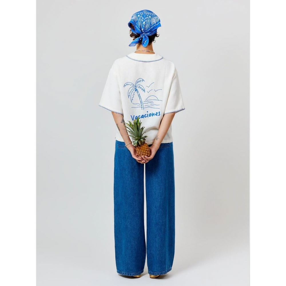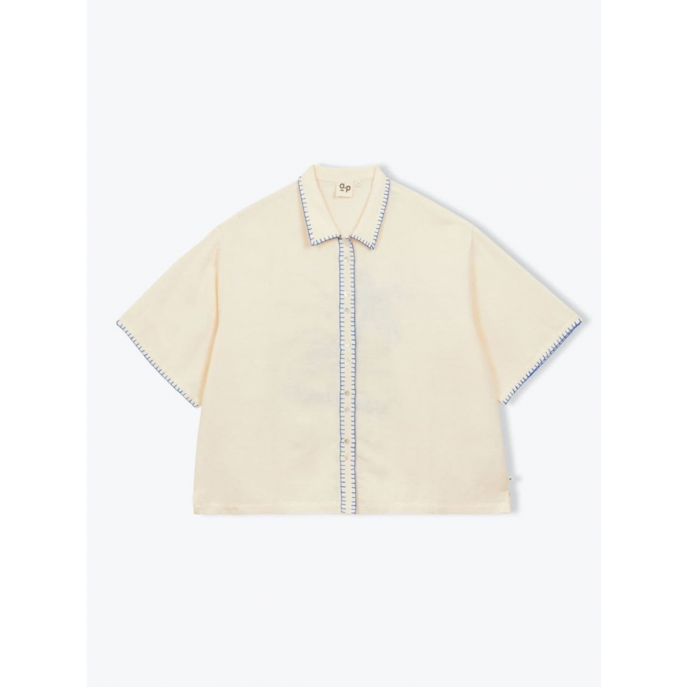 CHEMISE VACACIONES FEMME ECRU 12. TISSU EN COTON TEXTURE. COL CHEMISIER. MANCHES COURTES. FINITION BRODERIE SUR LE COL, MANCHES ET PATTE DE BOUTONNAGE. OUVERTURE BOUTONNÉE SUR LE MILIEU DEVANT. BRODERIE "VACACIONES" DANS LE MILIEU DOS. PETITES FENTES SUR LES CÔTÉS. ÉTIQUETTE POIS BLEU INSÉRÉE À LA COUTURE CÔTÉ.