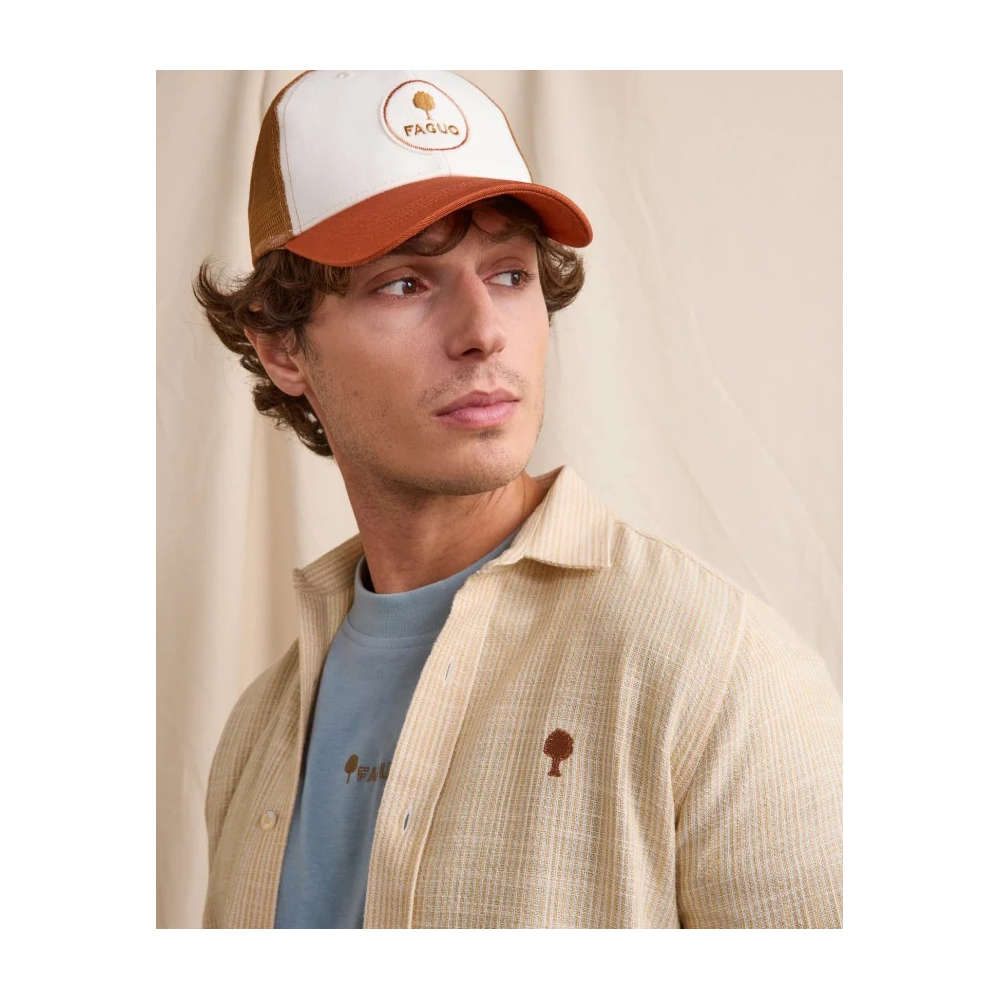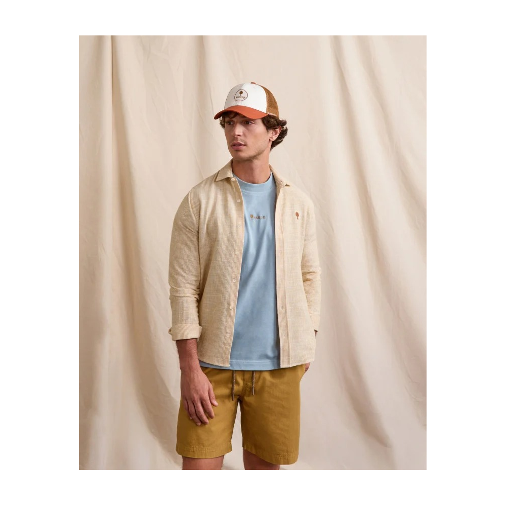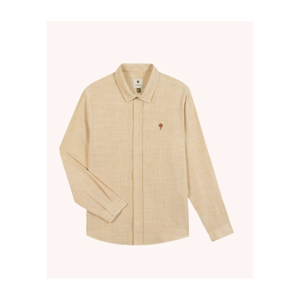 * CHEMISE IRATY CRÈME ET JAUNE À RAYURES, AU STYLE GRAPHIQUE SUBTIL. * COUPE DROITE AJUSTÉE POUR UNE SILHOUETTE STRUCTURÉE ET CONFORTABLE. * TOILE TEXTURÉE APPORTANT RELIEF ET CARACTÈRE. * FACILE À PORTER FERMÉE OU OUVERTE SUR UN T-SHIRT. * POLYVALENTE, IDÉALE AVEC JEAN OU CHINO. * BRODERIE ARBRE FAGUO POUR UNE SIGNATURE DISCRÈTE.