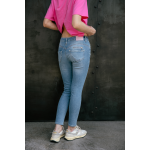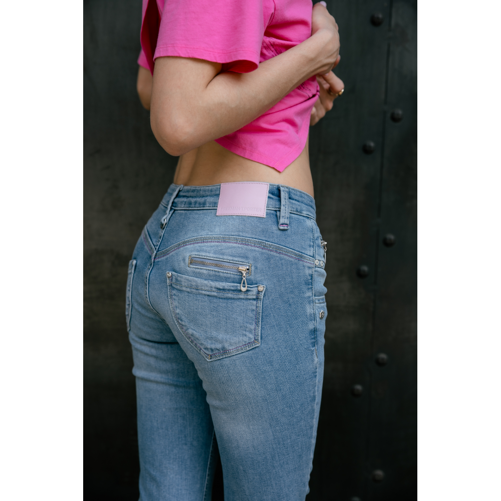 COUPE SUPER SLIM RACCOURCIE (JAMBE TRÈS AJUSTÉE AU-DESSUS DE LA CHEVILLE) POCHE AVANT AVEC FERMETURE ZIPPÉE ASYMÉTRIQUE SURPIQÛRES BEIGES CONTRASTANTES BOUTON ET RIVETS EN MÉTAL ARGENTÉ MAT DENIM SUPER STRETCH (TRÈS EXTENSIBLE) BLEU CLAIR