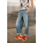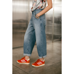 COUPE BOYFRIEND (COUPE AMPLE D'INSPIRATION MASCULINE, RESSERRÉE AUX HANCHES) TOILE DENIM RIGIDE (SANS STRETCH, TENUE AUTHENTIQUE) DÉLAVAGE BLEU MOYEN AVEC LÉGERS CONTRASTES LARGE REVERS EN BAS DE JAMBE FERMETURE PAR BRAGUETTE ZIPPÉE ET BOUTON ARGENTÉ DÉTAILS DE SURPIQÛRES BEIGE CLAIR ET ORANGÉES JACRON (ÉCUSSON DE MARQUE) ORANGE À L'ARRIÈRE