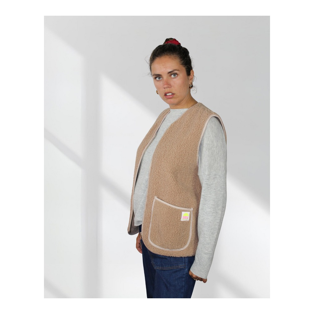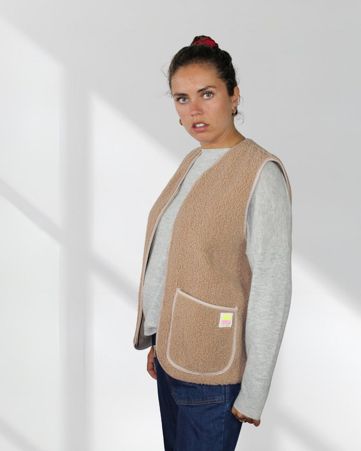 GILET MOUMOUTE ZIPPÉ, SANS MANCHES. SE PORTE OUVERT OU FERMÉ. SA COUPE OVERSIZE ET SON ÉTIQUETTE DISCRÈTE VOUS FERA AVOIR UN STYLE "SPORTWEAR". TAILLE UNIQUE FERMETURE ÉCLAIR COUPE OVERSIZE DEUX POCHES FABRIQUÉ EN ITALIE COMPOSITION : 100% POLYESTER