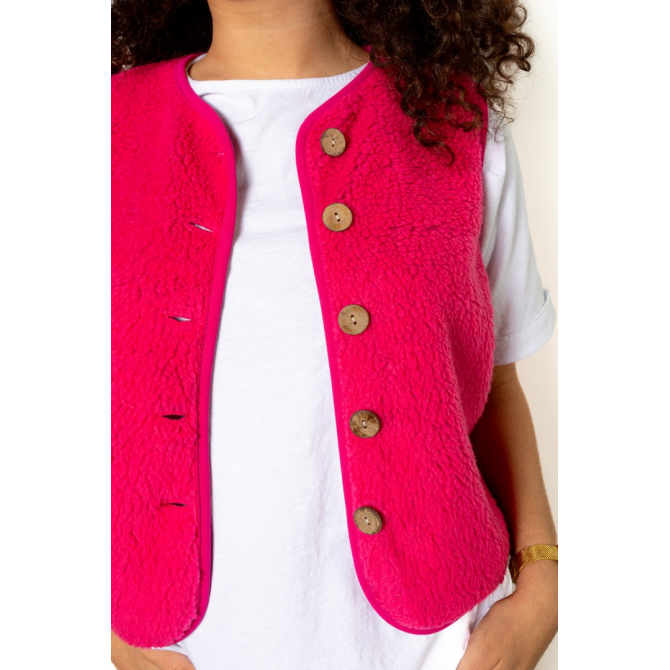 GILET MOUMOUTE SANS MANCHES. COUPE DROITE PATTE DE BOUTONNAGE BOUTONS EN BOIS TAILLE UNIQUE CONFECTIONNÉ EN ITALIE COMPOSITION : 100% POLYESTER