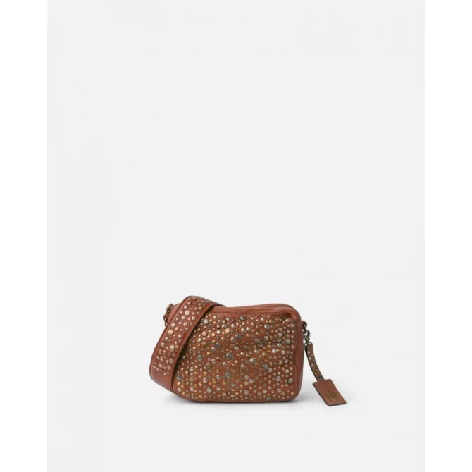 PETIT SAC BANDOULIÈRE CARRÉ EN CUIR DE VACHETTE LAVÉ. CLOUS MÉTALLIQUES SUR LE DEVANT. FERMETURE ZIPPÉE. BANDOULIÈRE COURTE AMOVIBLE, BANDOULIÈRE RÉGLABLE ET AMOVIBLE. POCHES INTÉRIEURES. DOUBLURE EN COTON.