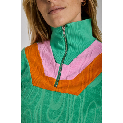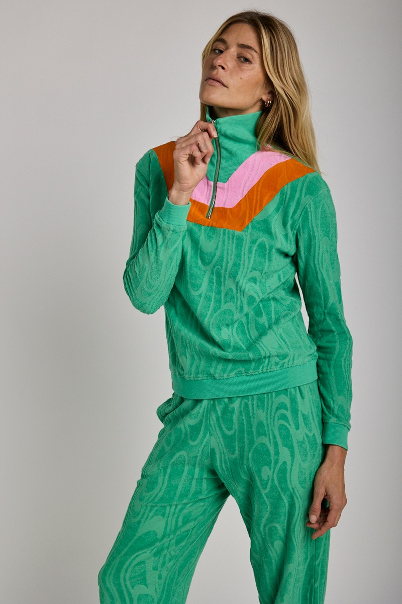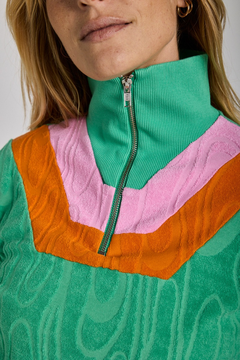 SWEAT MOCK NECK ÉPONGE JACQUARD 100% COTON ORGANIQUE. EFFET NON GRATTÉ, PROVENANCE MATIÈRE TURQUIE. DEUX VERSIONS : EN VERT AVEC EMPIÈCEMENTS ROSE & ORANGE AU COL, OU ORANGE ET EMPIÈCEMENTS VERT & ROSE AU COL. COL MONTANT AVEC DEMI-ZIP YKK / MOTIF JACQUARD.