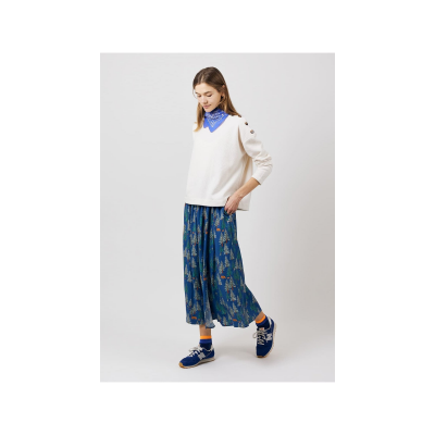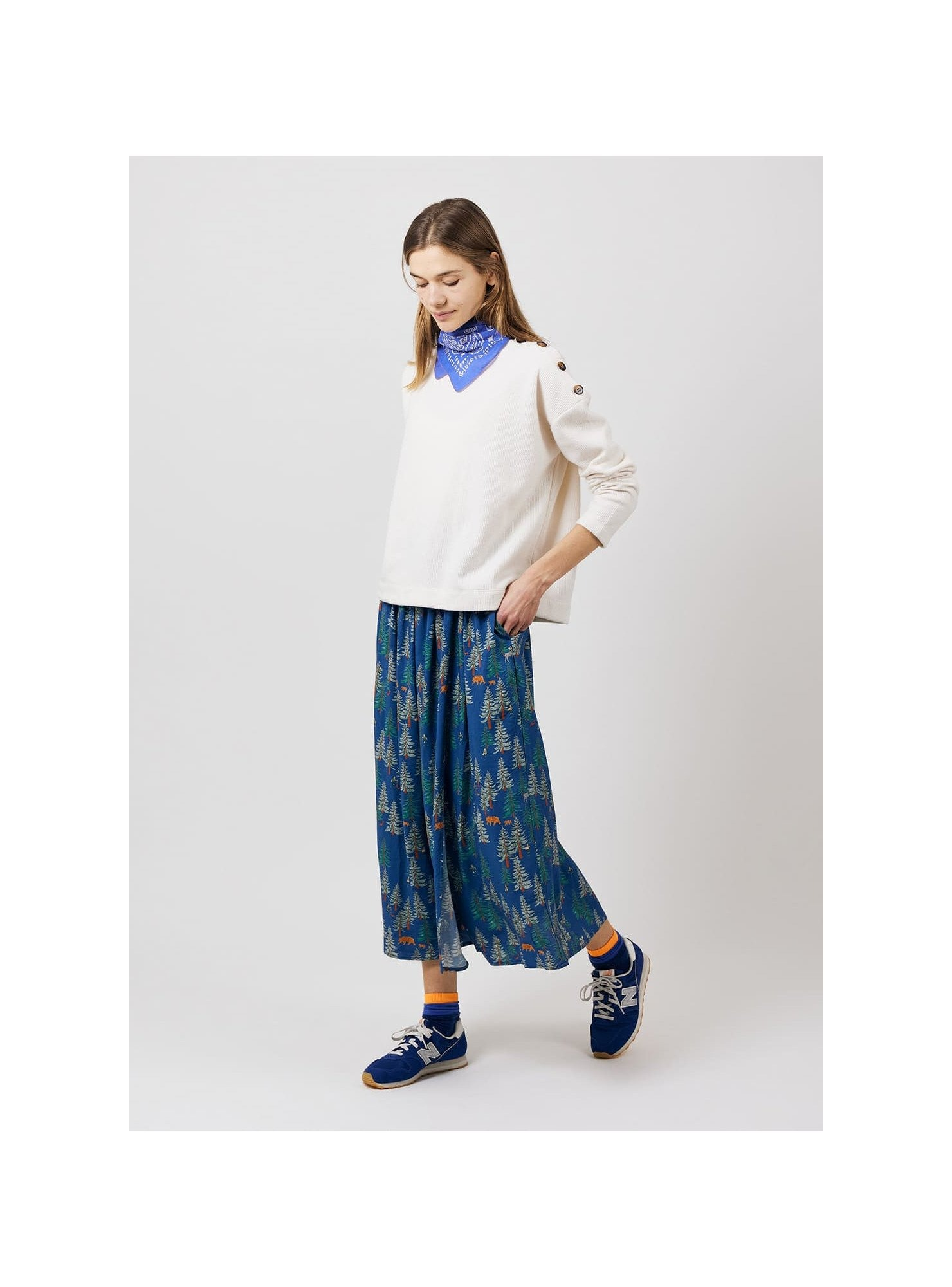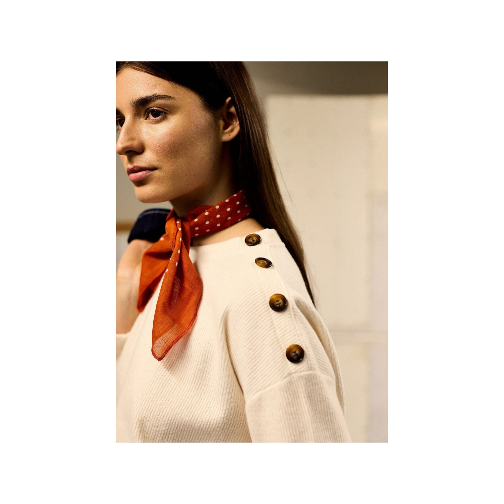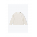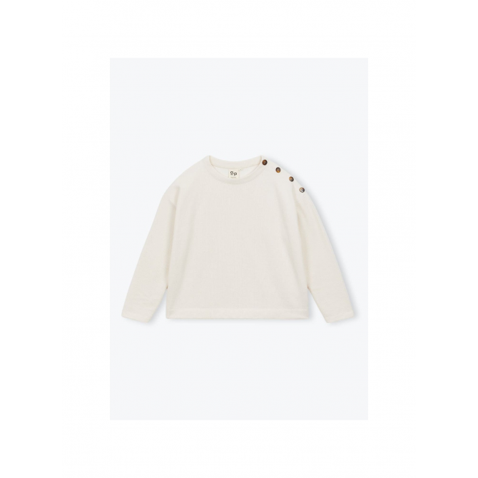 ARSENE ET LES PIPELETTES - SWEAT MAILLE A COTES MAILLE DOUBLE FACE À COTES EN COTON BIO. COL ROND ET COUPE BASIC. MANCHES LONGUES. DÉTAIL DE BOUTONS À L'ÉPAULE. ARIANE MESURE 1M78 ET PORTE LE SWEAT ÉCRU DANS UNE TAILLE S 70% COTON BIOLOGIQUE 30% POLYESTER RECYCLÉ TRICOTÉ