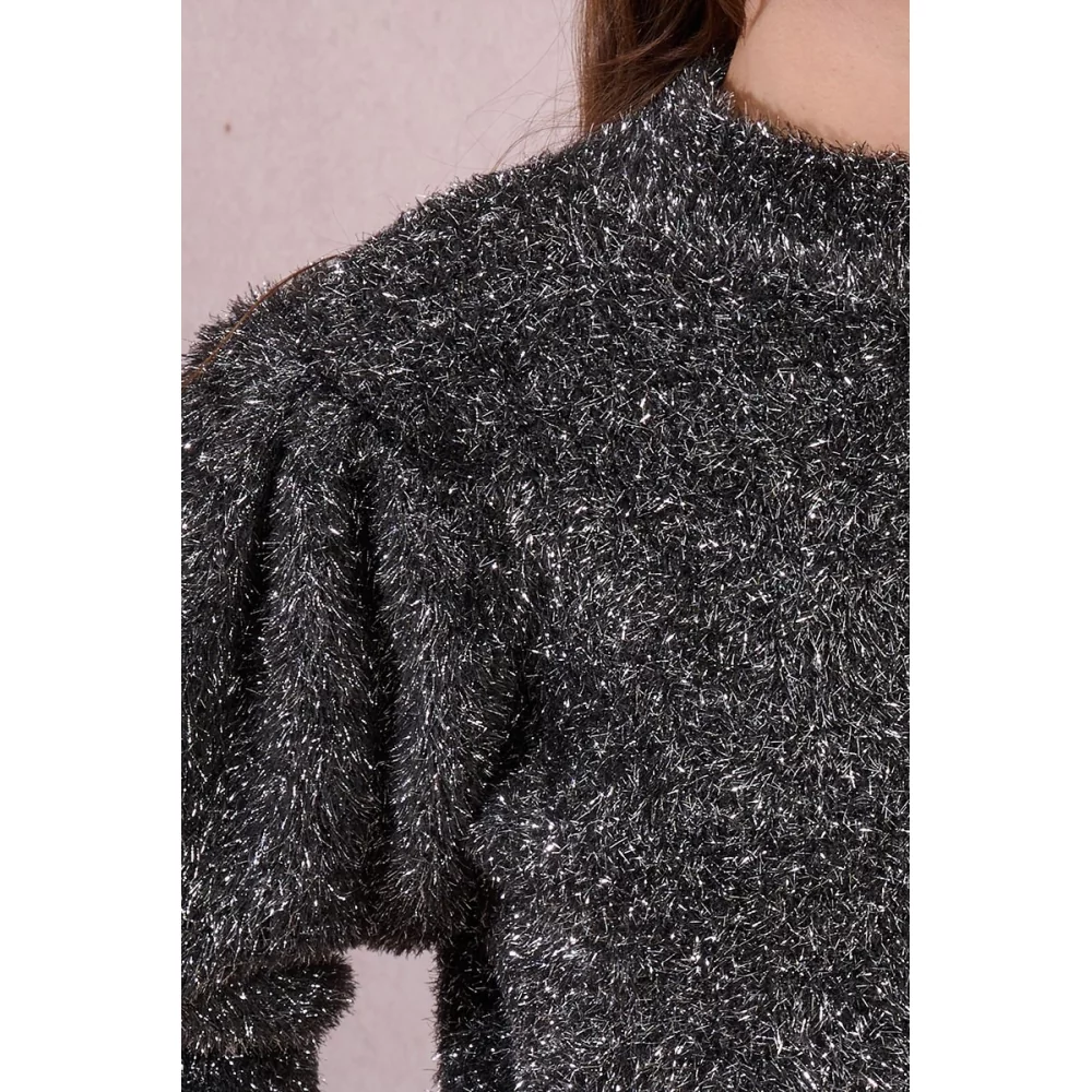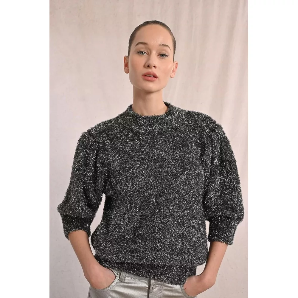 -PULL EN MAILLE TEXTURÉE ET IRISÉE -COL SEMI-MONTANT -MANCHES 3/4 BALLON -COUPE DROITE -ÉPAULES À FRONCES -FINITION COL, BAS DE MANCHES ET BAS VÊTEMENT CÔTELÉ -LONGUEUR DEPUIS L'ÉPAULE 58 CM POUR UNE TAILLE S MATIÈRE PRINCIPALE : 63% POLYESTER, 25% VISCOSE, 12% NYLON