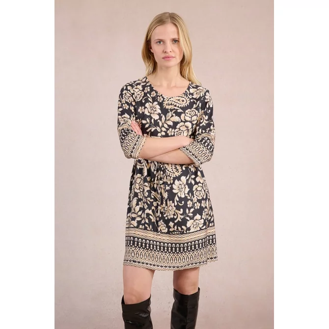 -ROBE COURTE DROITE -MANCHES 3/4 -LARGE ENCOLURE RONDE -CEINTURE À NOUER À LA TAILLE -LONGUEUR DEPUIS L'ÉPAULE 90 CM POUR UNE TAILLE S MATIÈRE PRINCIPALE : 100% VISCOSE