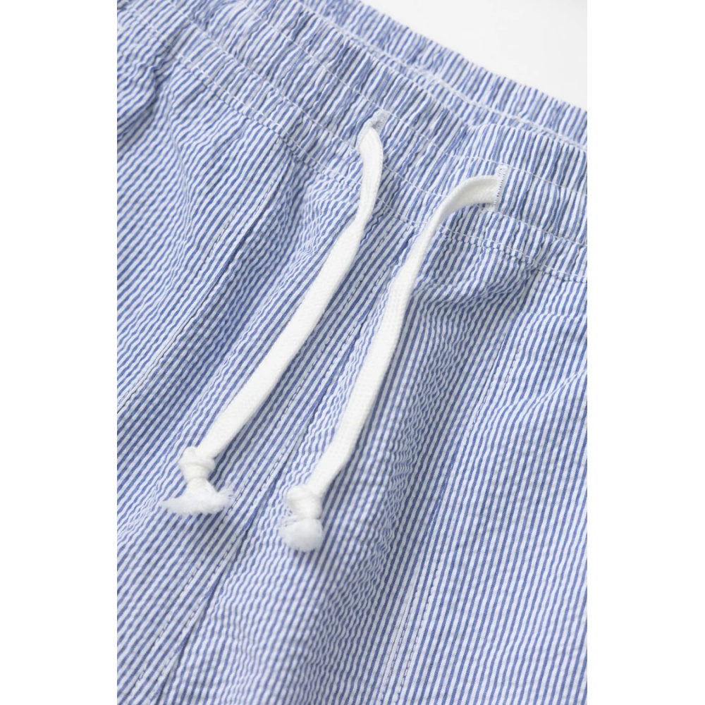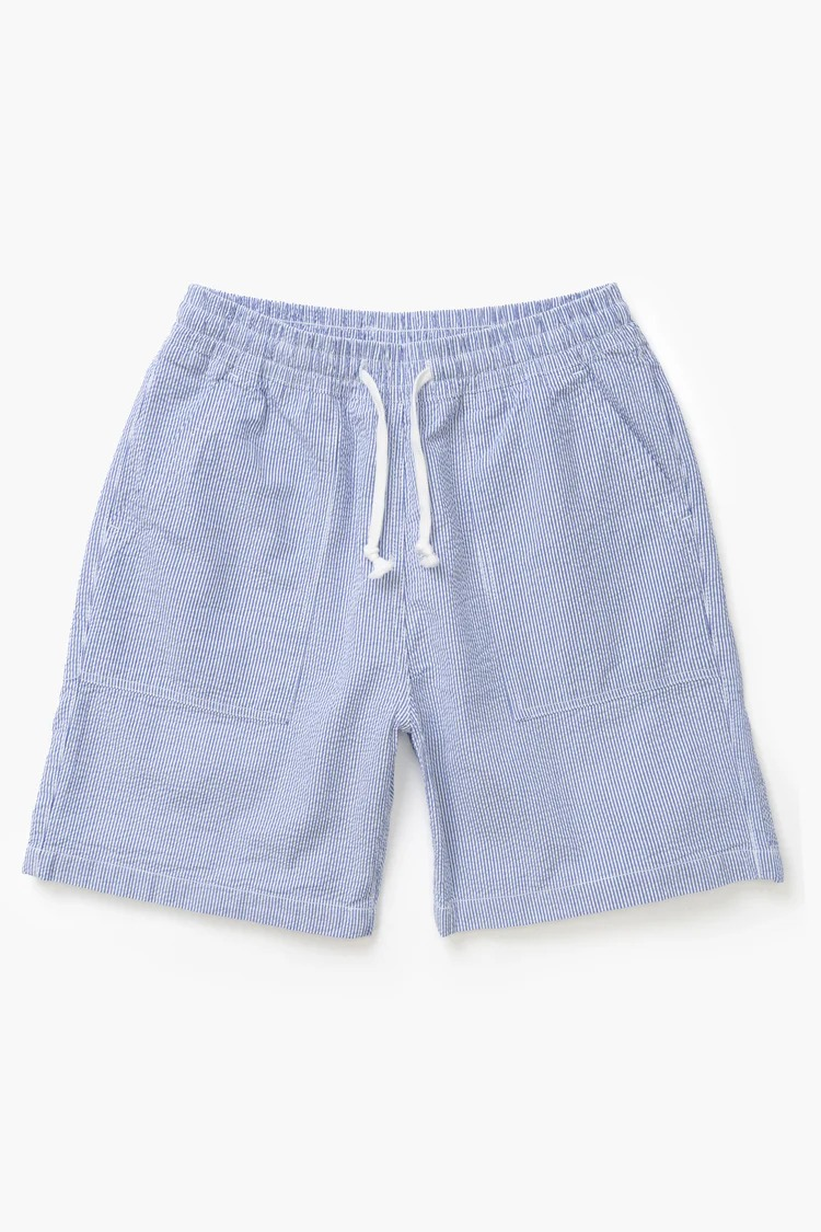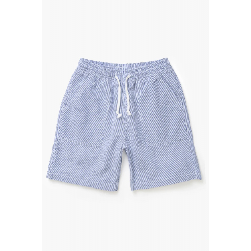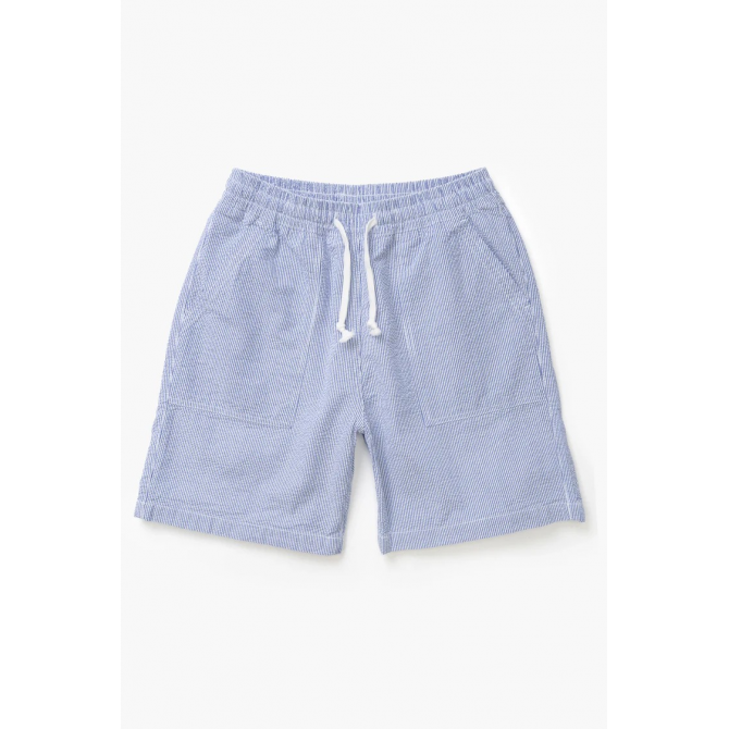 SHORT DE CHEF EN SEERSUCKER PAR SERVICE WORKS COUPE DÉCONTRACTÉE COTON SEERSUCKER BIOLOGIQUE CERTIFIÉ GOTS, 200 G/M² TEINT EN PIÈCE TAILLE AJUSTABLE AVEC CORDON DE SERRAGE POCHES AVANT DE TYPE « FATIGUE » POCHES ARRIÈRE AVEC ÉTIQUETTE TISSÉE