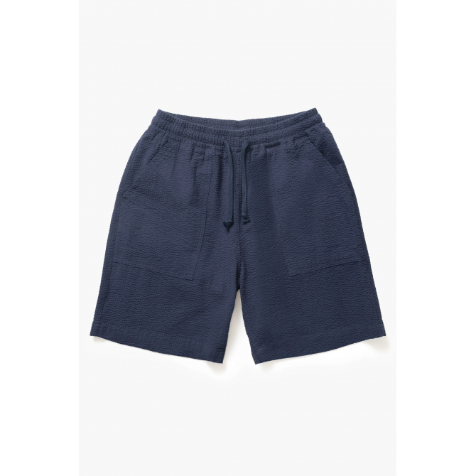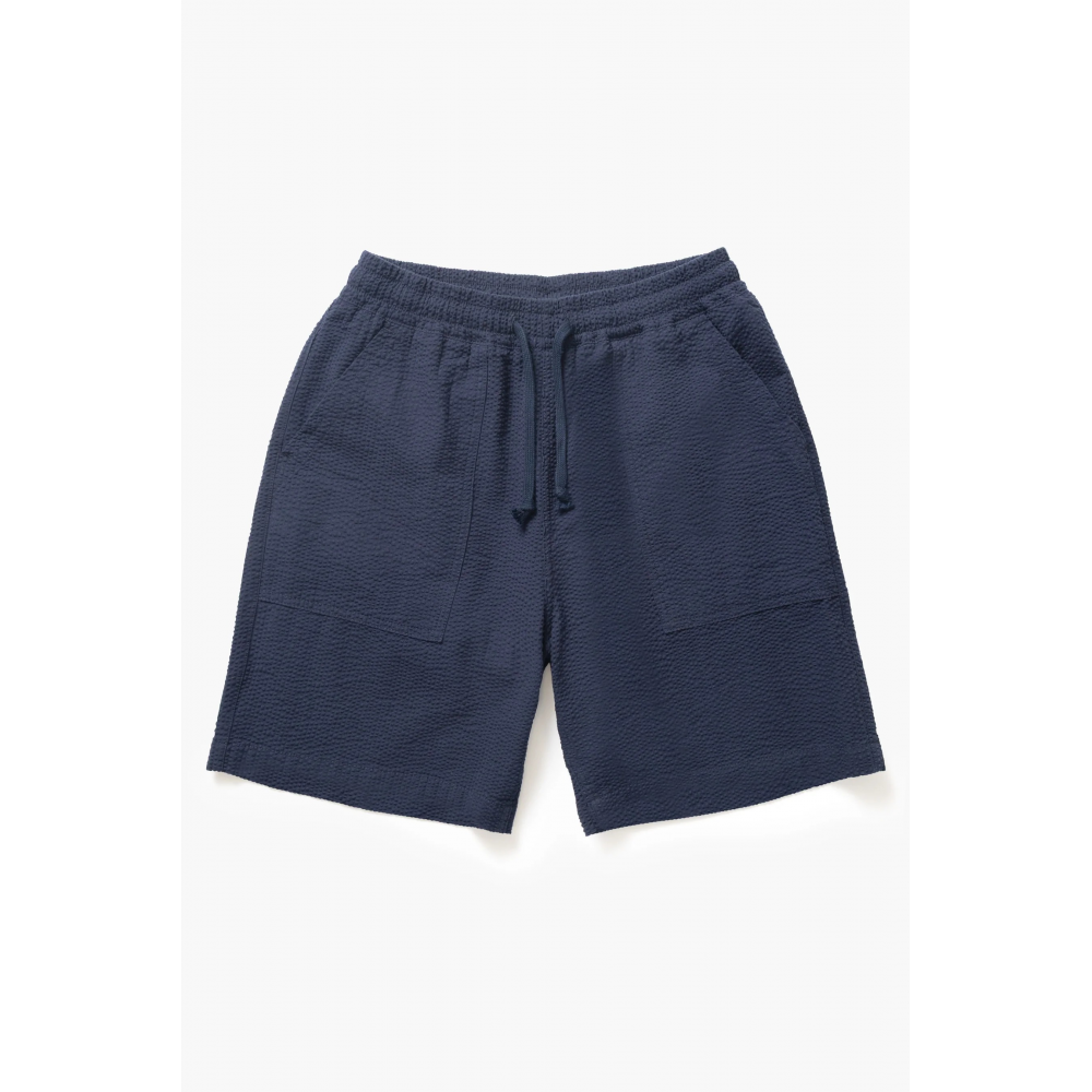 SHORT DE CHEF EN SEERSUCKER PAR SERVICE WORKS COUPE DÉCONTRACTÉE COTON SEERSUCKER BIOLOGIQUE CERTIFIÉ GOTS, 200 G/M² TEINT EN PIÈCE TAILLE AJUSTABLE AVEC CORDON DE SERRAGE POCHES AVANT DE TYPE « FATIGUE » POCHES ARRIÈRE AVEC ÉTIQUETTE TISSÉE