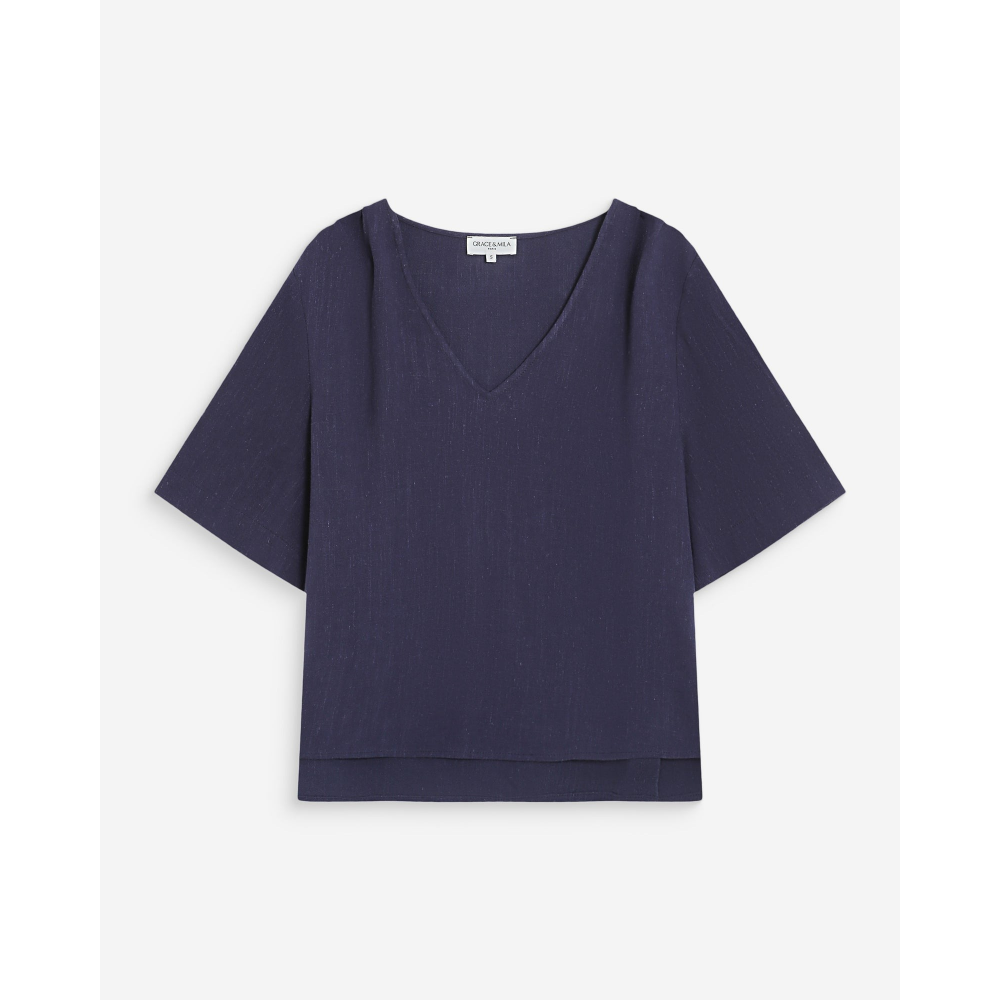 L'ENCOLURE EN V DU TOP LARGE VIOLON SUBLIME LE PORT DE TÊTE ET LE DÉCOLLETÉ. LES MANCHES MI-LONGUES ET LES LÉGERS PLIS AUX ÉPAULES APPORTENT UNE TOUCHE DE DOUCEUR ET DÉLÉGANCE À LA SILHOUETTE. LE TISSU FLUIDE ET LÉGER DU TOP À MANCHES 3/4 VIOLON ÉPOUSE LES MOUVEMENTS ET PROPOSE UNE ALLURE LÉGÈRE ET DÉCONTRACTÉE.