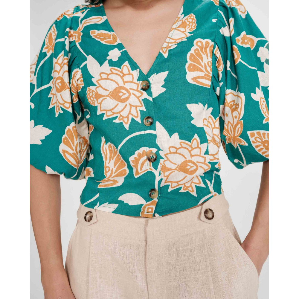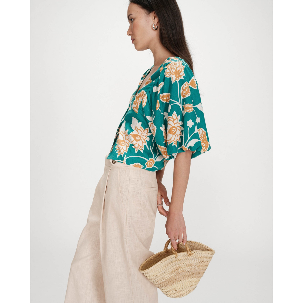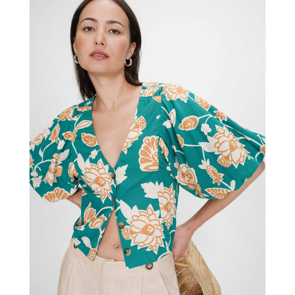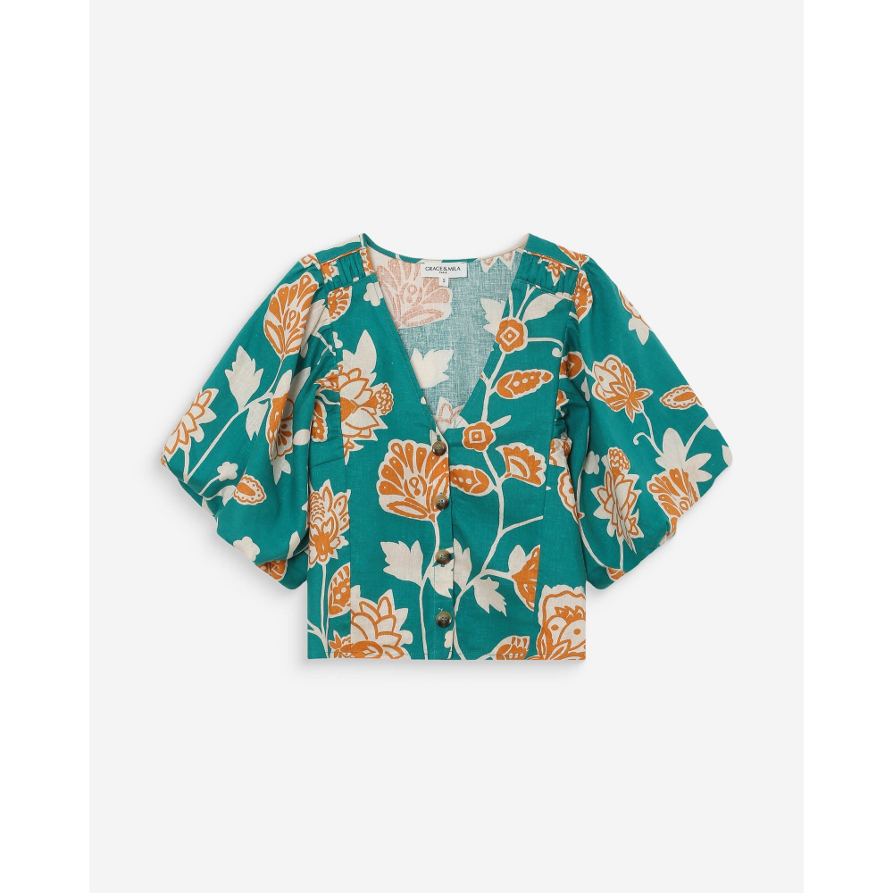 - TOP COURT - IMPRIMÉ FLORAL - MANCHES COURTES BOUFFANTES - DÉCOLLETÉ EN V - PATTE DE BOUTONNAGE SUR LE DEVANT - FRONCES À LEMPIÈCEMENT - TAILLE SMOCKÉE AU DOS