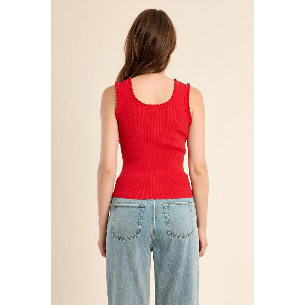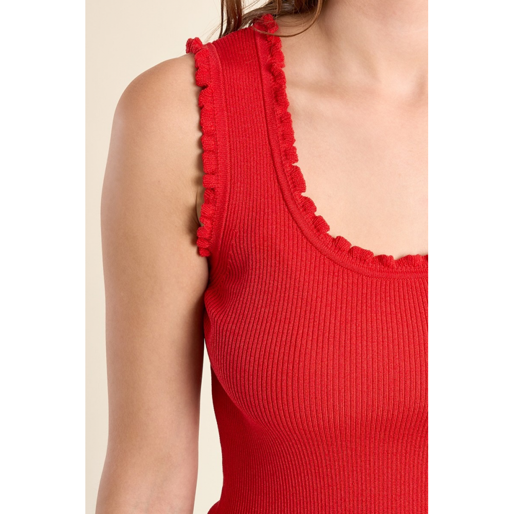 DÉBARDEUR CÔTELÉ -LARGES BRETELLES -ENCOLURE CARRÉE -COUPE CINTRÉE -FINITION VOLANTÉE SUR LE DÉCOLLETÉ ET LES EMMANCHURES -LONGUEUR DEPUIS L'ÉPAULE 55CM POUR UNE TAILLE S
